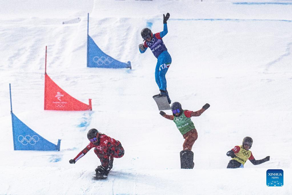 Caterina Carpano (2nd L) of Italy competes during the mixed team snowboard cross quaterfinals of Beijing 2022 Winter Olympics at Genting Snow Park in Zhangjiakou, north China's Hebei Province, Feb. 12, 2022. (Xinhua/Xiao Yijiu)