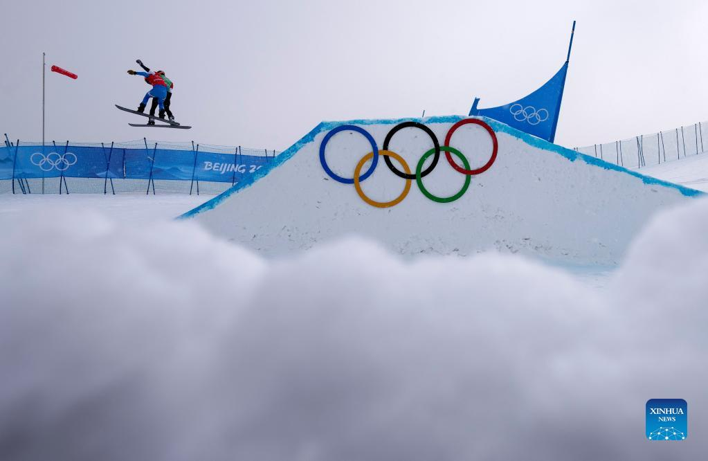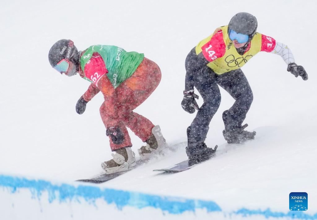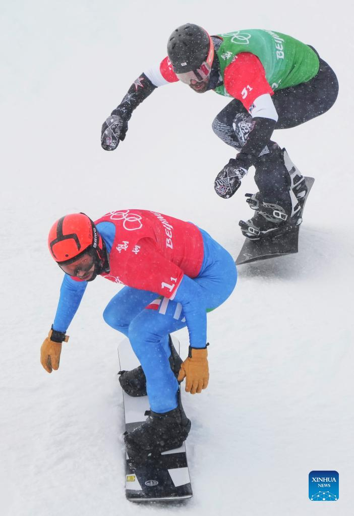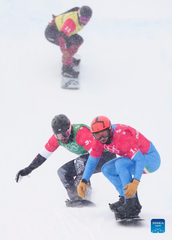 Omar Visintin (R front) of Italy and Nick Baumgartner (L front) of the United States compete during the mixed team snowboard cross semifinals at Genting Snow Park in Zhangjiakou, North China's Hebei Province, Feb. 12, 2022. (Xinhua/Yang Shiyao)