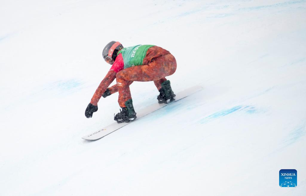 Eliot Grondin of Canada comepetes during the mixed team snowboard cross quaterfinals of Beijing 2022 Winter Olympics at Genting Snow Park in Zhangjiakou, north China's Hebei Province, Feb. 12, 2022. (Xinhua/Wang Haofei)