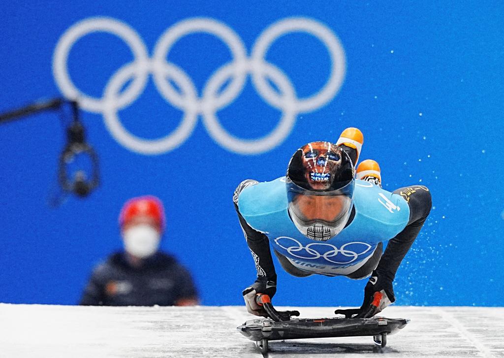 Christopher Grotheer of Germany competes during skeleton men heat of Beijing 2022 Winter Olympics at National Sliding Centre in Yanqing District, Beijing, capital of China, Feb. 11, 2022. (Xinhua/He Zhangshan)