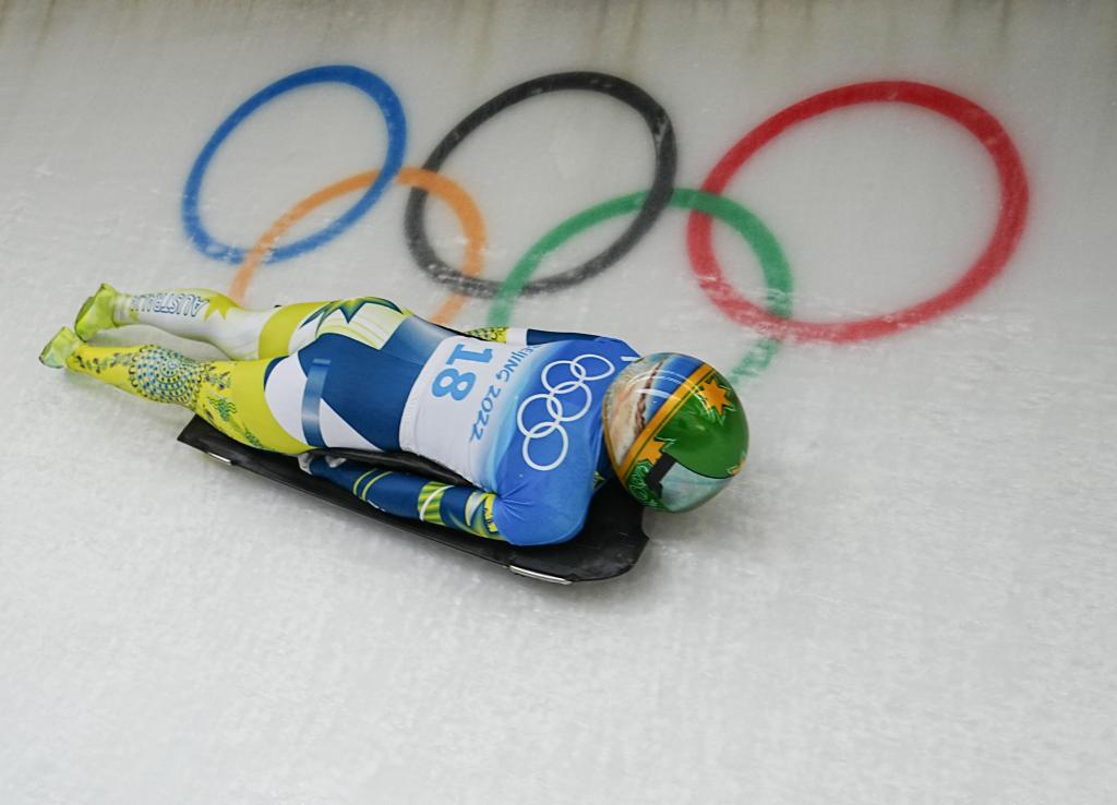 Jaclyn Narracott of Australia competes during skeleton women heat of Beijing 2022 Winter Olympics at National Sliding Centre in Yanqing District, Beijing, capital of China, Feb. 11, 2022. (Xinhua/Sun Fei)