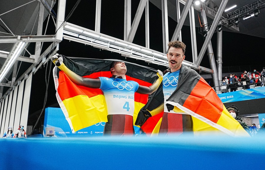 Christopher Grotheer (L) and Axel Jungk of Germany celebrate after skeleton men heat of Beijing 2022 Winter Olympics at National Sliding Centre in Yanqing District, Beijing, capital of China, Feb. 11, 2022. (Xinhua/Jiang Wenyao)