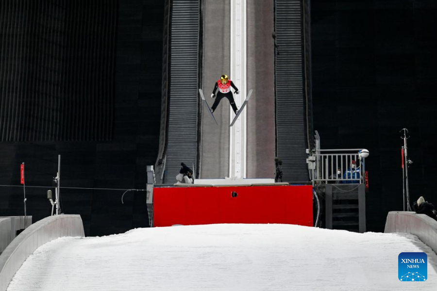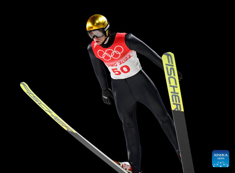 Karl Geiger of Germany competes during ski jumping men's large hill individual at the National Ski Jumping Centre in Zhangjiakou, north China's Hebei Province, Feb. 12, 2022. (Xinhua/Dai Tianfang)
