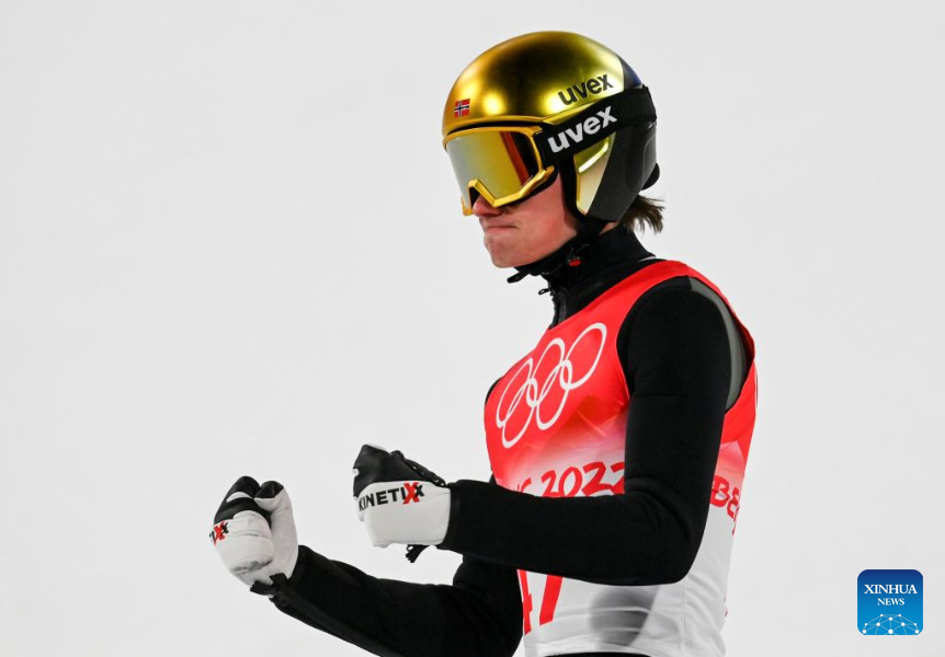 Marius Lindvik of Norway celebrates during ski jumping men's large hill individual at the National Ski Jumping Centre in Zhangjiakou, north China's Hebei Province, Feb. 12, 2022. (Xinhua/Feng Kaihua)