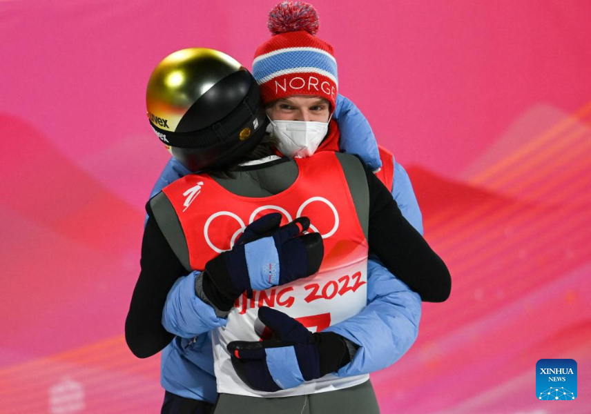 Marius Lindvik (rear) of Norway celebrates after ski jumping men's large hill individual at the National Ski Jumping Centre in Zhangjiakou, north China's Hebei Province, Feb. 12, 2022. (Xinhua/Feng Kaihua)