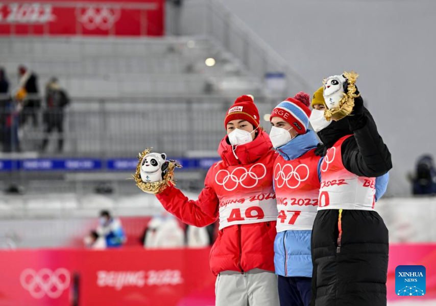 Gold medalist Marius Lindvik (C) of Norway, silver medalist Kobayashi Ryoyu (L) of Japan and bronze medalist Karl Geiger of Germany pose during the flower ceremony of ski jumping men's large hill individual at the National Ski Jumping Centre in Zhangjiakou, north China's Hebei Province, Feb. 12, 2022. (Xinhua/Feng Kaihua)