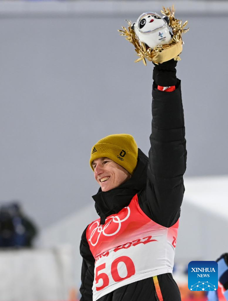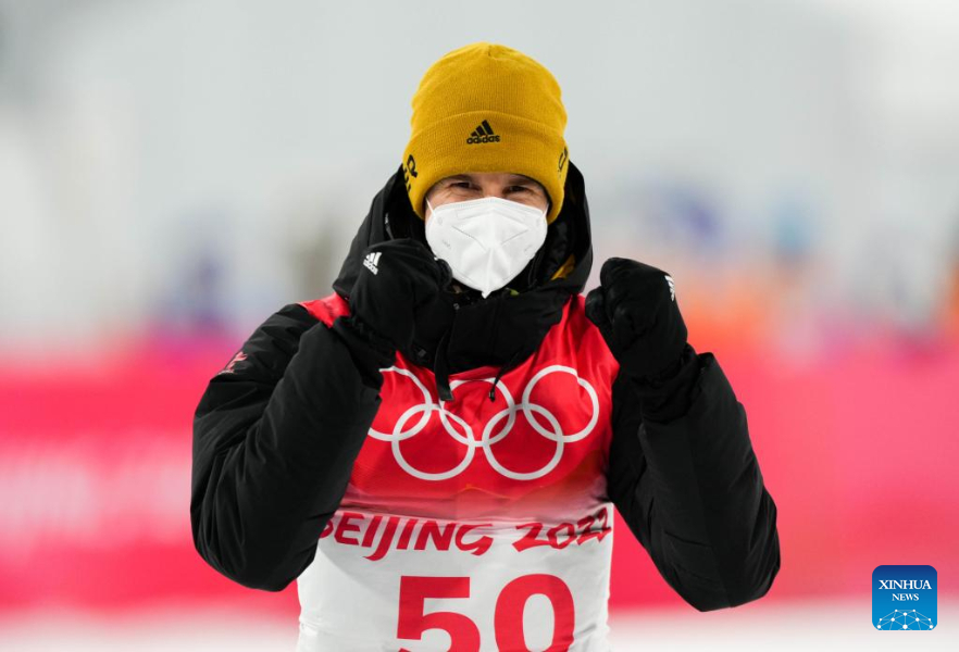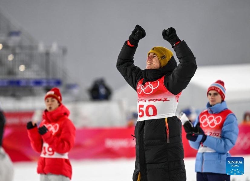 Karl Geiger of Germany celebrates after ski jumping men's large hill individual at the National Ski Jumping Centre in Zhangjiakou, north China's Hebei Province, Feb. 12, 2022. (Xinhua/Wang Song)