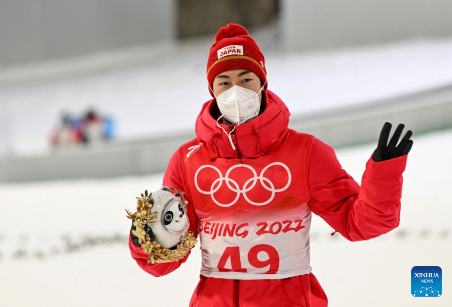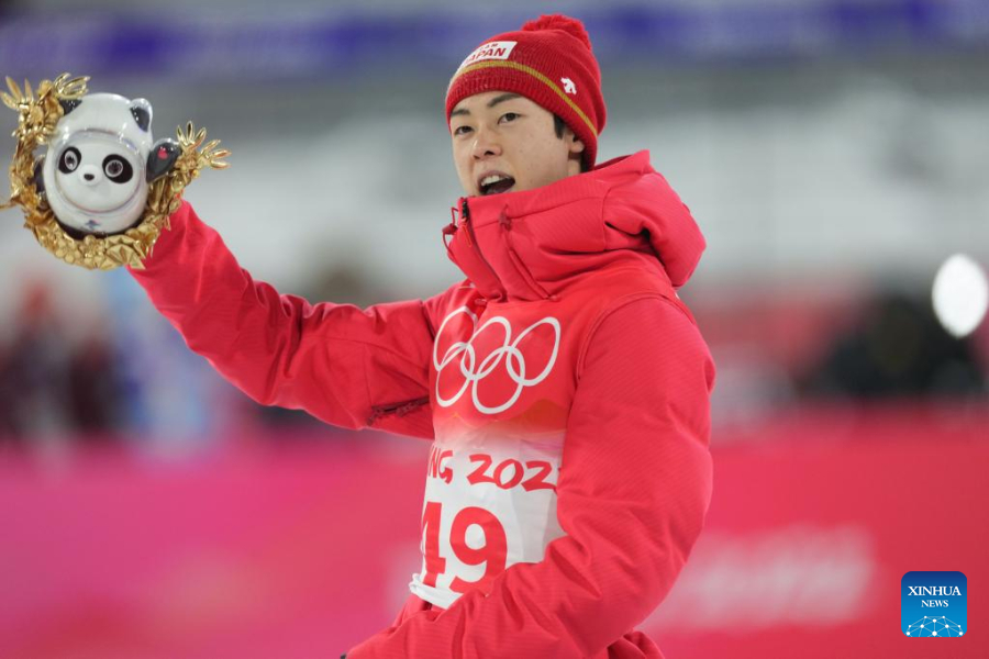 Silver medalist Kobayashi Ryoyu of Japan reacts during the flower ceremony of ski jumping men's large hill individual at the National Ski Jumping Centre in Zhangjiakou, north China's Hebei Province, Feb. 12, 2022. (Xinhua/Feng Kaihua)