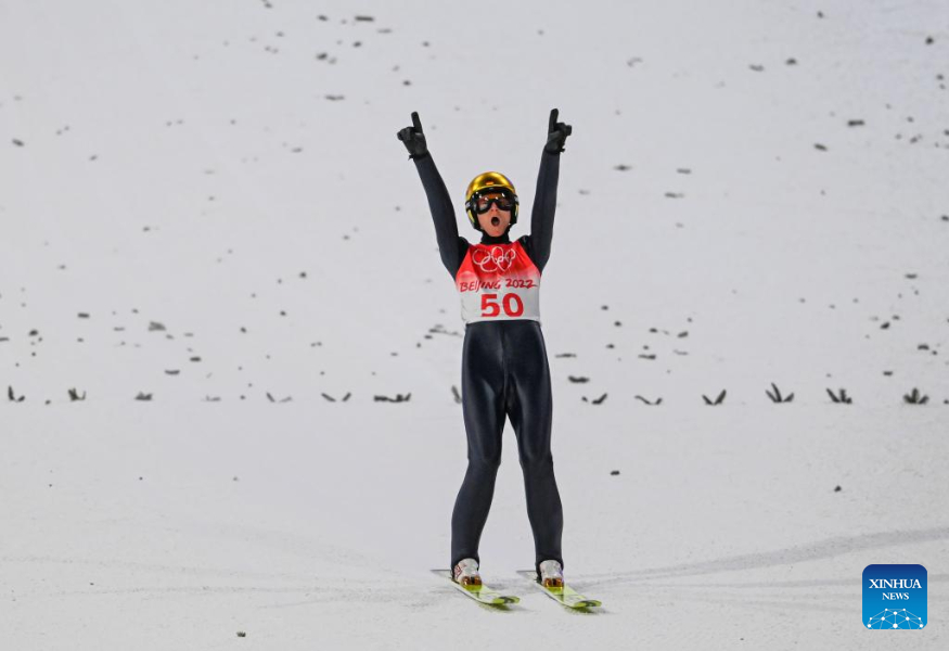 Karl Geiger of Germany celebrates during ski jumping men's large hill individual at the National Ski Jumping Centre in Zhangjiakou, north China's Hebei Province, Feb. 12, 2022. (Xinhua/Feng Kaihua)