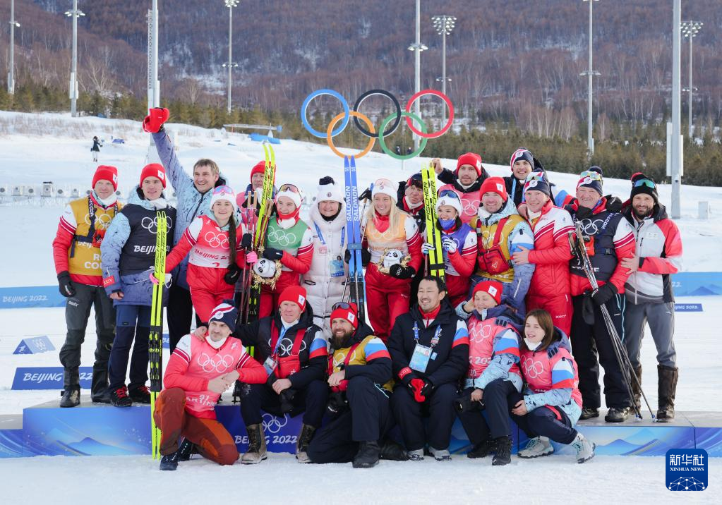 Athletes of Team ROC pose for a group photo after the cross-country skiing women's 4x5 km relay of the Beijing Winter Olympics at National Cross-Country Skiing Centre in Zhangjiakou, north China's Hebei Province, Feb. 12, 2022. (Xinhua/Liu Chan)