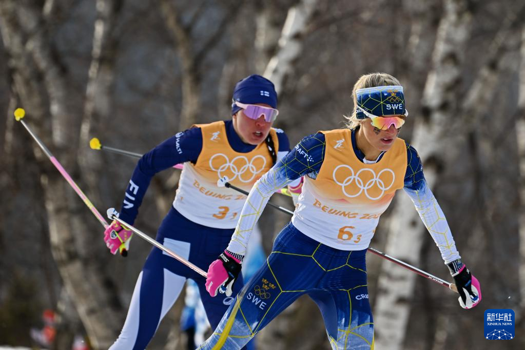 Frida Karlsson (R) of Sweden competes during the cross-country skiing women's 4x5 km relay of the Beijing Winter Olympics at National Cross-Country Skiing Centre in Zhangjiakou, north China's Hebei Province, Feb. 12, 2022. (Xinhua/Mu Yu)