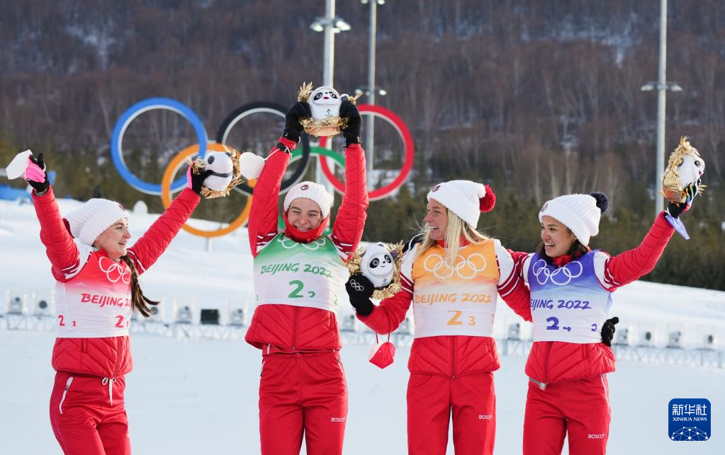 Gold medalists Team ROC celebrate after the cross-country skiing women's 4x5 km relay of the Beijing Winter Olympics at National Cross-Country Skiing Centre in Zhangjiakou, north China's Hebei Province, Feb. 12, 2022. (Xinhua/Liu Chan)