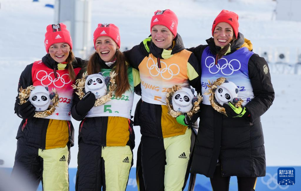 Silver medalists Team Germany celebrate during the flower ceremony of the cross-country skiing women's 4x5 km relay of the Beijing Winter Olympics at National Cross-Country Skiing Centre in Zhangjiakou, north China's Hebei Province, Feb. 12, 2022. (Xinhua/Liu Chan)