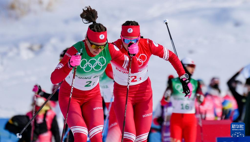 Natalia Nepryaeva (L) and Yulia Stupak of ROC compete during the cross-country skiing women's 4x5 km relay of the Beijing Winter Olympics at National Cross-Country Skiing Centre in Zhangjiakou, north China's Hebei Province, Feb. 12, 2022. (Xinhua/Liu Chan)