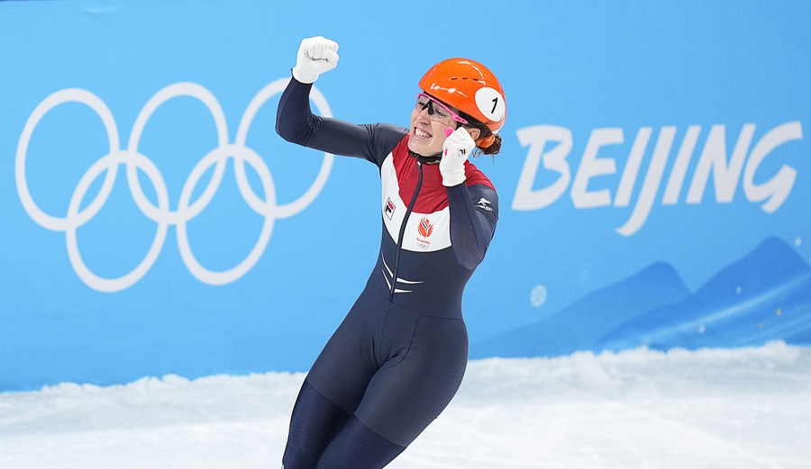 Suzanne Schulting of the Netherlands celebrates after the women's 1,000m final of short track speed skating at Capital Indoor Stadium in Beijing, capital of China, Feb. 11, 2022. (Xinhua/Xiong Qi)