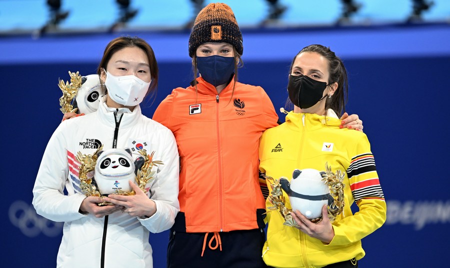 Suzanne Schulting (C) of the Netherlands, Choi Minjeong (L) of South Korea and Hanne Desmet of Belgium attend the flower ceremony after the women's 1,000m final of short track speed skating at Capital Indoor Stadium in Beijing, capital of China, Feb. 11, 2022. (Xinhua/Li Yibo)■