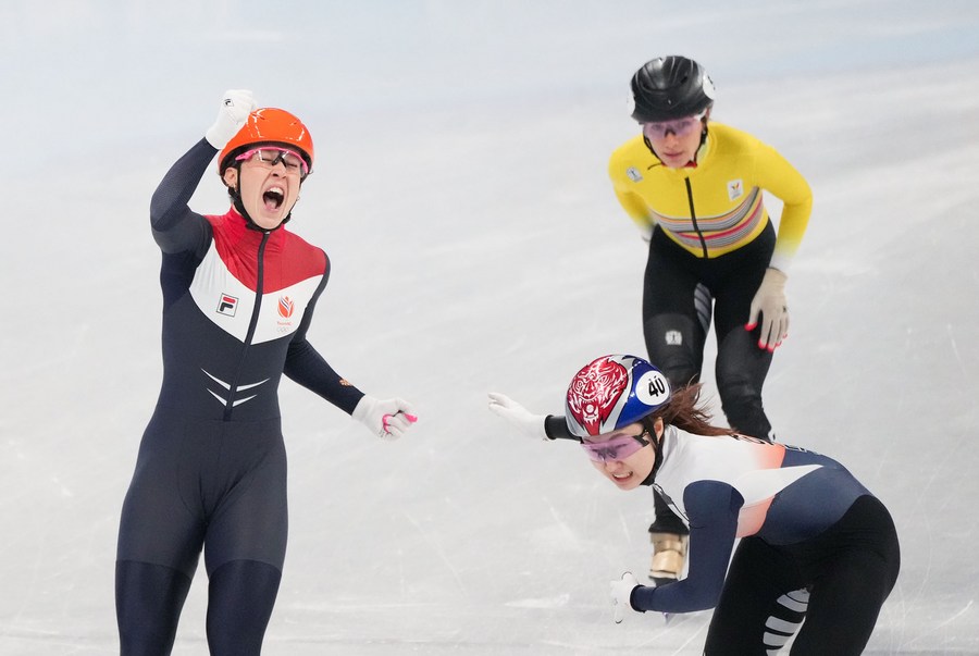 Suzanne Schulting of the Netherlands celebrates after the women's 1,000m final of short track speed skating at Capital Indoor Stadium in Beijing, capital of China, Feb. 11, 2022. (Xinhua/Ma Ning)