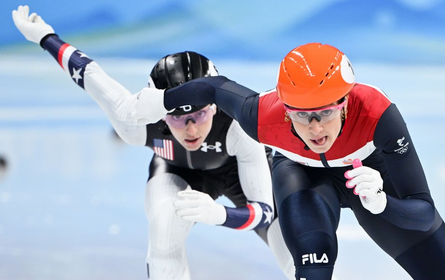Suzanne Schulting (front) of the Netherlands competes during the women's 1,000m short track speed skating final at Capital Indoor Stadium in Beijing, capital of China, Feb. 11, 2022. (Xinhua/Ju Huanzong)