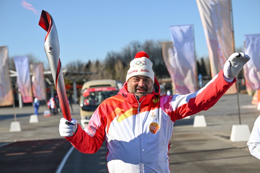 Torch bearer Yiannis Exarchos runs with the torch during the Beijing 2022 Olympic Torch Relay at the Olympic Forest Park in Beijing on Feb. 4, 2022. (Xinhua/Li He)