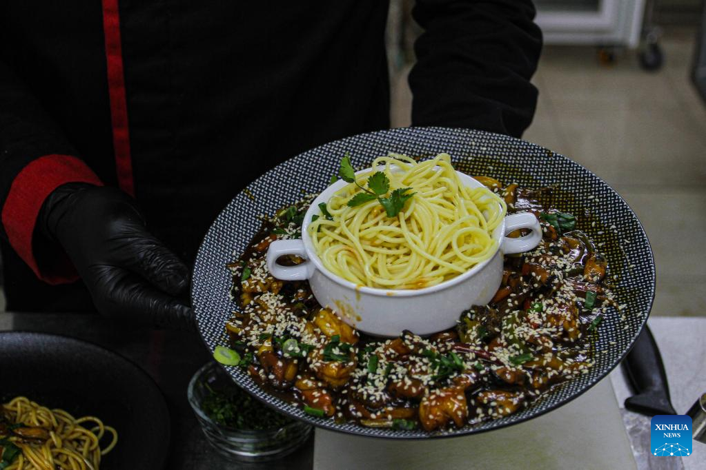 Ibrahim Badwan, a chef, prepares Chinese dishes at Mzaaq center for culinary arts education, in Gaza City, Feb. 6, 2022. (Photo by Rizek Abdeljawad/Xinhua)