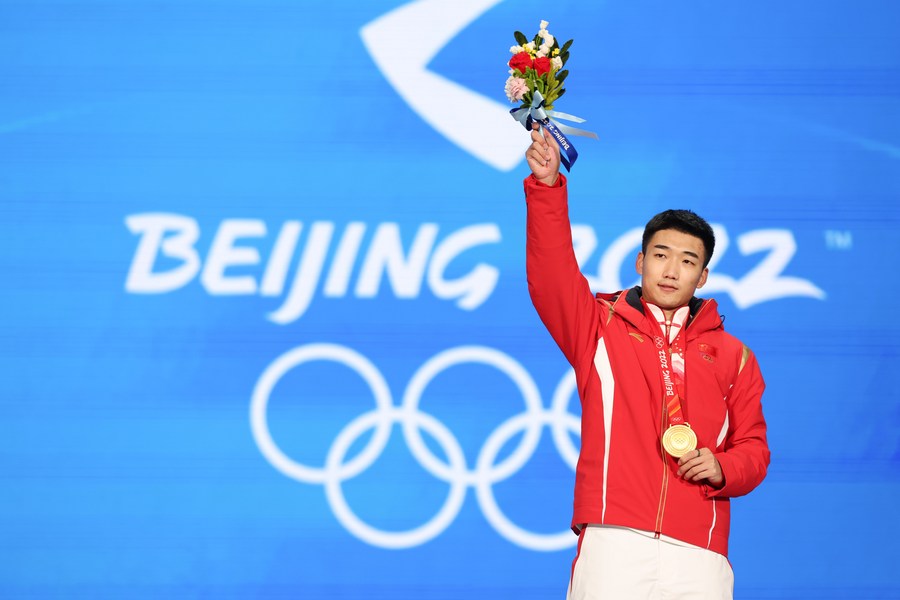 Gold medalist Gao Tingyu of China reacts during the award ceremony of speed skating men's 500m at the Beijing Medals Plaza of the Winter Olympics in Beijing on Feb. 12, 2022. (Xinhua/Cheng Tingting)