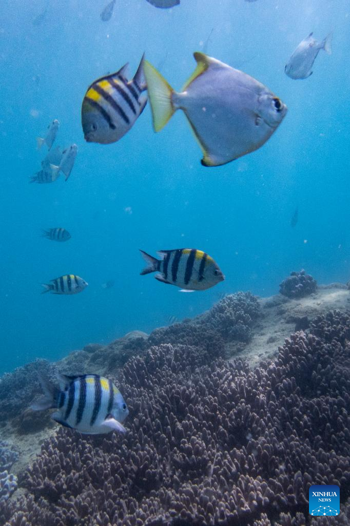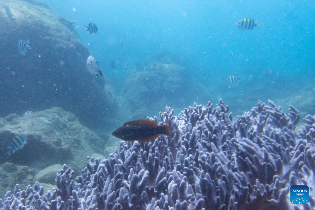 Photo taken on Feb. 12, 2022 shows corals and fish near Wuzhizhou Island of Sanya, south China's Hainan Province. Coral planting activities are held here in recent years to raise public awareness of marine environmental protection. (Xinhua/Zhang Liyun)