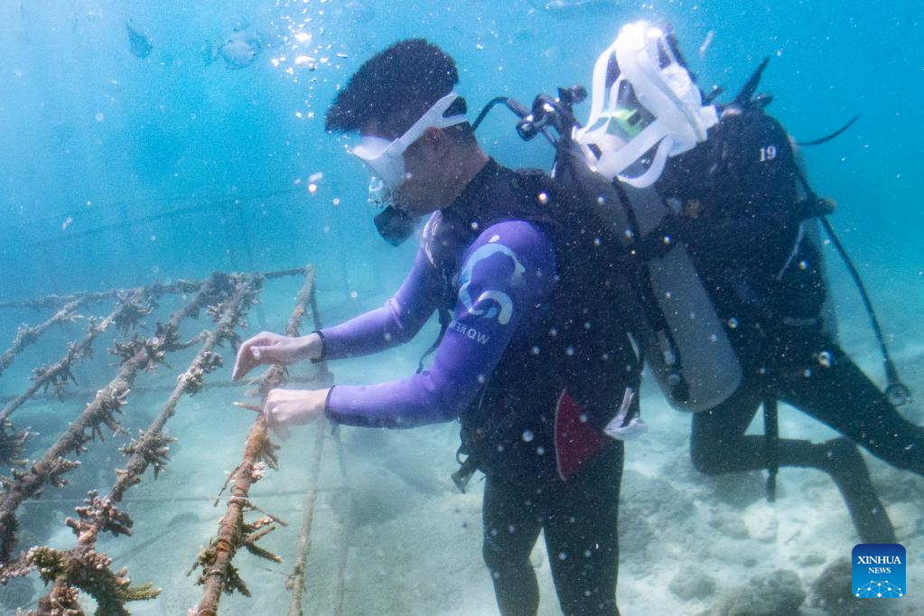 A visitor experiences planting corals near Wuzhizhou Island of Sanya, south China's Hainan Province, Feb. 12, 2022. Coral planting activities are held here in recent years to raise public awareness of marine environmental protection. (Xinhua/Zhang Liyun)
