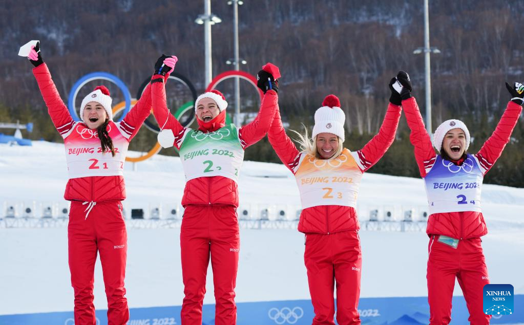 Yulia Stupak (1st L), Natalia Nepryaeva (2nd L), Tatiana Sorina (2nd R) and Veronika Stepanova (1st R) of ROC pose for photos after the cross-country skiing women's 4 x 5km relay at National Cross-Country Skiing Centre in Zhangjiakou, North China's Hebei Province, Feb. 12, 2022. (Xinhua/Liu Chan)