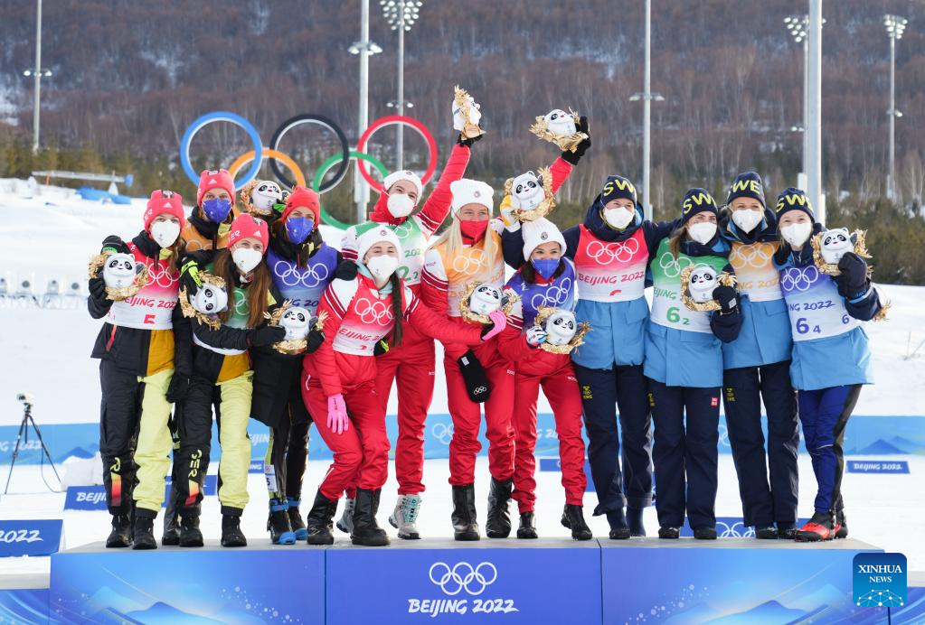 Gold medalists of team ROC (C), silver medalists of team Germany (L) and bronze medalists of team Sweden pose for photos during the flower ceremony after the cross-country skiing women's 4 x 5km relay at National Cross-Country Skiing Centre in Zhangjiakou, North China's Hebei Province, Feb. 12, 2022. (Xinhua/Liu Chan)