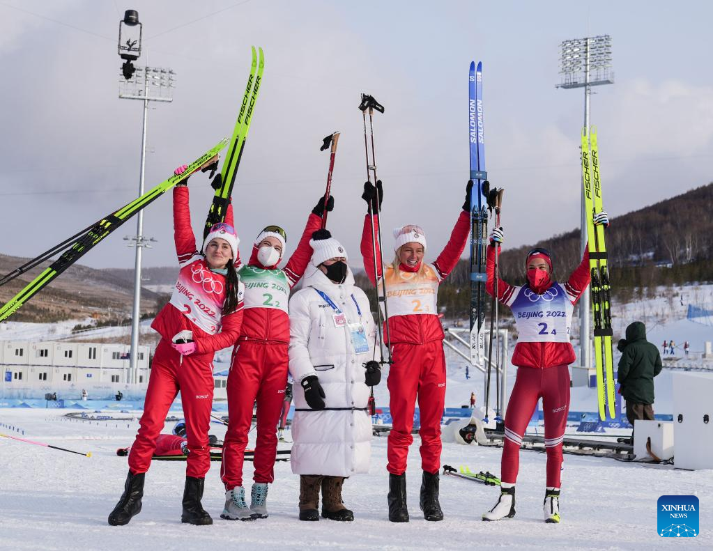 Yulia Stupak, Natalia Nepryaeva, Tatiana Sorina and Veronika Stepanova of ROC (L to R) pose for photos after the cross-country skiing women's 4 x 5km relay at National Cross-Country Skiing Centre in Zhangjiakou, North China's Hebei Province, Feb. 12, 2022. (Xinhua/Liu Chan)