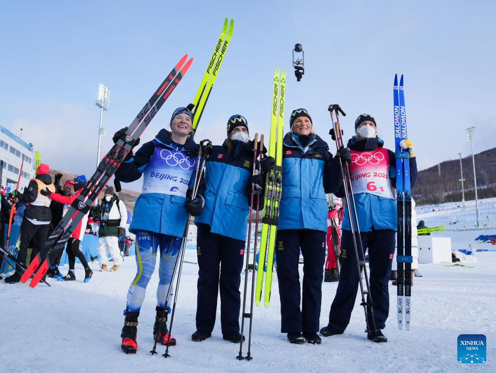 (L to R) Jonna Sundling, Ebba Andersson, Frida Karlsson and Maja Dahlqvist of Sweden pose for photos after the cross-country skiing women's 4 x 5km relay at National Cross-Country Skiing Centre in Zhangjiakou, North China's Hebei Province, Feb. 12, 2022. (Xinhua/Liu Chan)