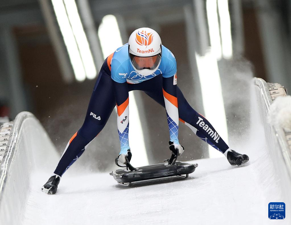 Kimberley Bos of the Netherlands competes during the skeleton women heat of Beijing 2022 Winter Olympics at National Sliding Centre in Yanqing District, Beijing, capital of China, Feb. 12, 2022. (Xinhua/Yao Jianfeng)