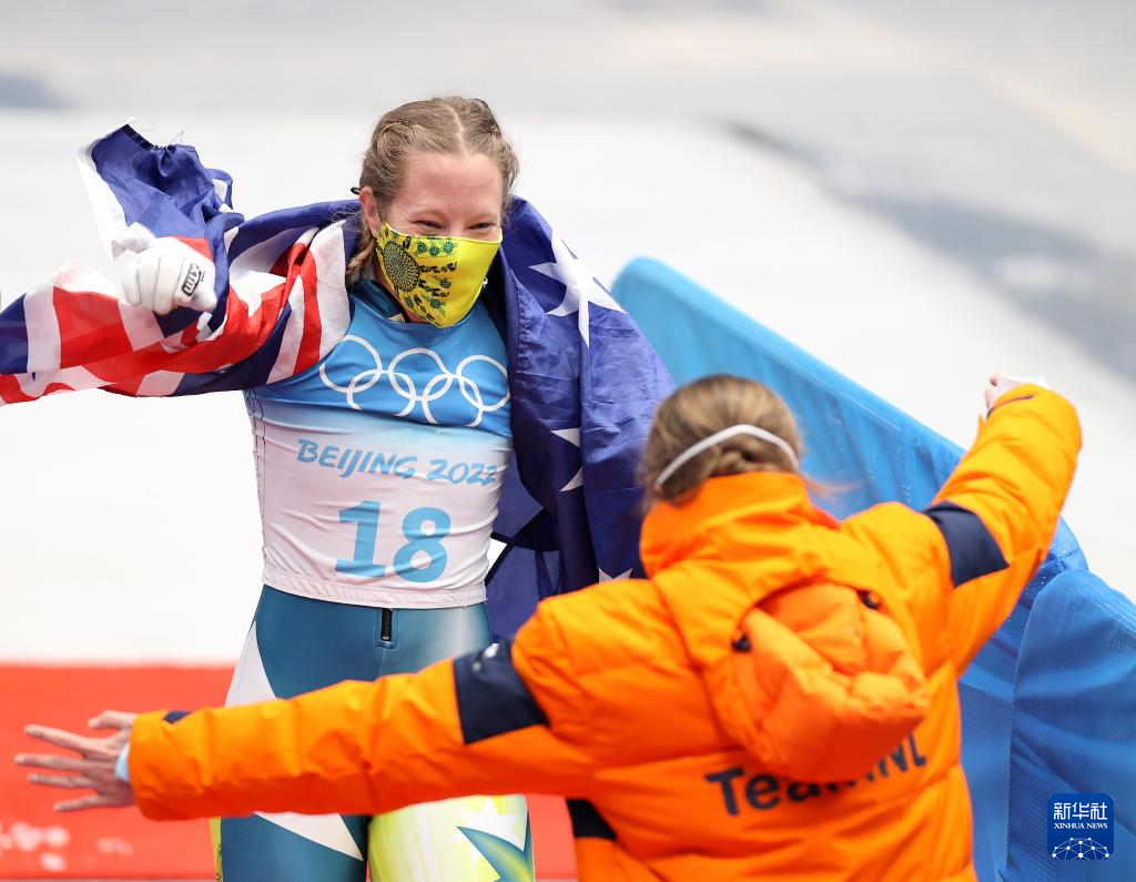 Jaclyn Narracott of Australia celebrates after winning the silver medal in the skeleton women heat of Beijing 2022 Winter Olympics at National Sliding Centre in Yanqing District, Beijing, capital of China, Feb. 12, 2022. (Xinhua/Yao Jianfeng)