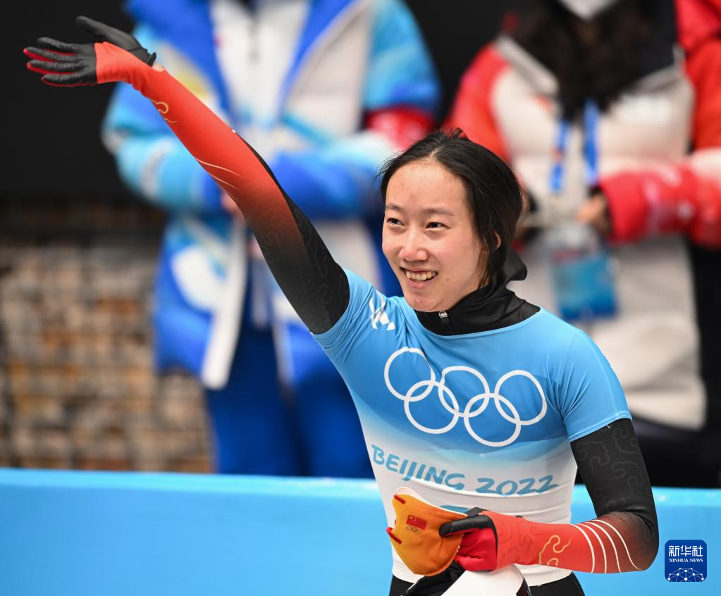 Zhao Dan of China reacts after the skeleton women heat of Beijing 2022 Winter Olympics at National Sliding Centre in Yanqing District, Beijing, capital of China, Feb. 12, 2022. (Xinhua/Sun Fei)