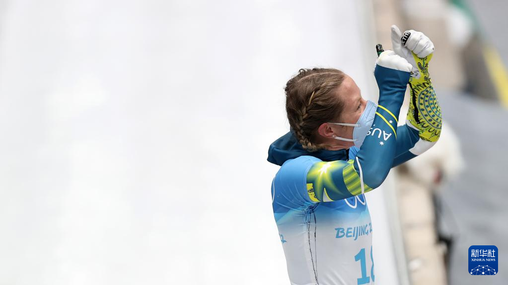 Jaclyn Narracott of Australia give a thumbs-up sign during the skeleton women heat of Beijing 2022 Winter Olympics at National Sliding Centre in Yanqing District, Beijing, capital of China, Feb. 12, 2022. (Xinhua/Yao Jianfeng)