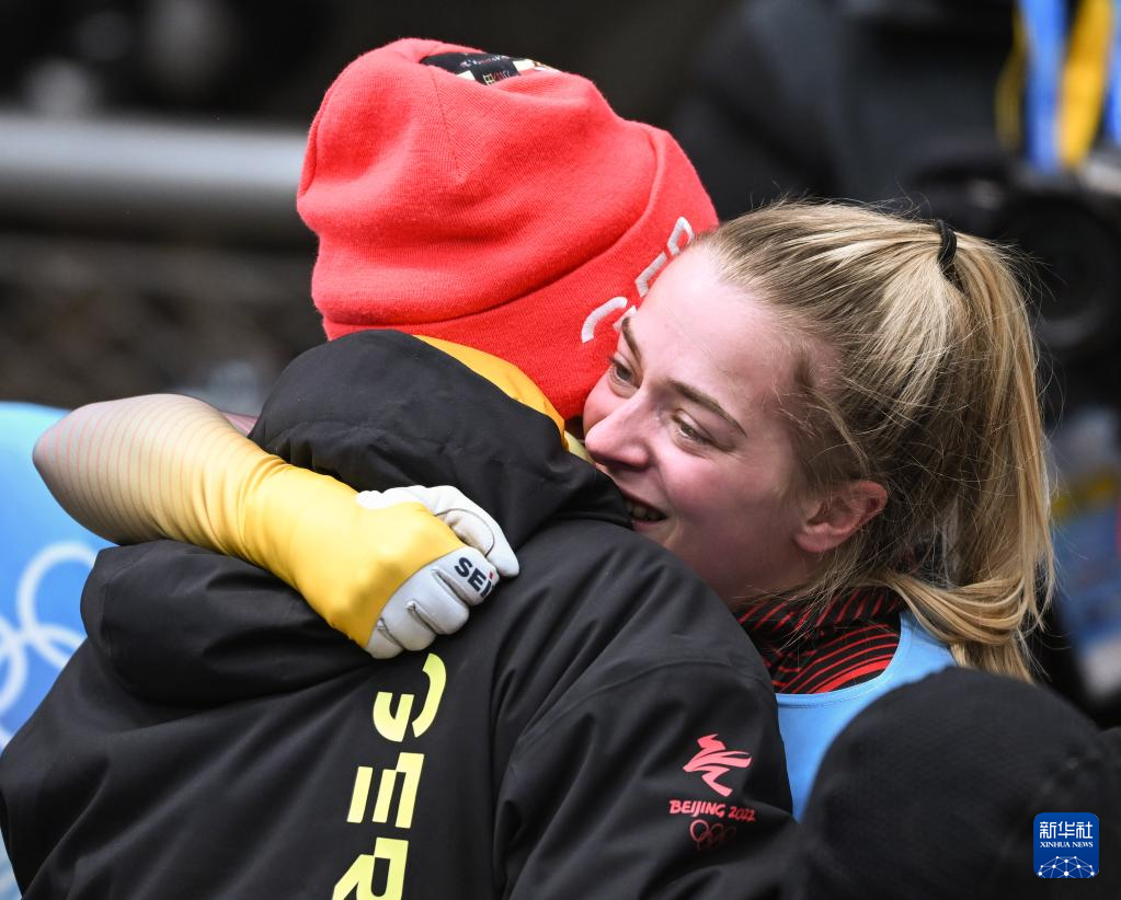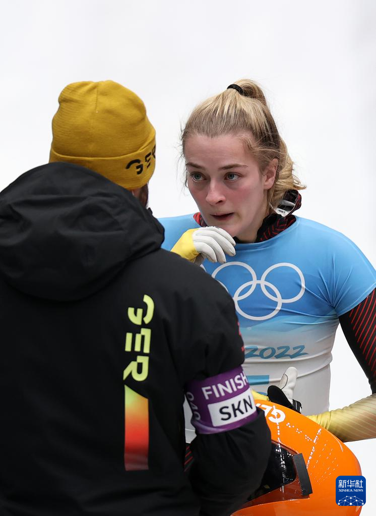 Hannah Neise (R) of Germany reacts during the skeleton women heat of Beijing 2022 Winter Olympics at National Sliding Centre in Yanqing District, Beijing, capital of China, Feb. 12, 2022. (Xinhua/Yao Jianfeng)