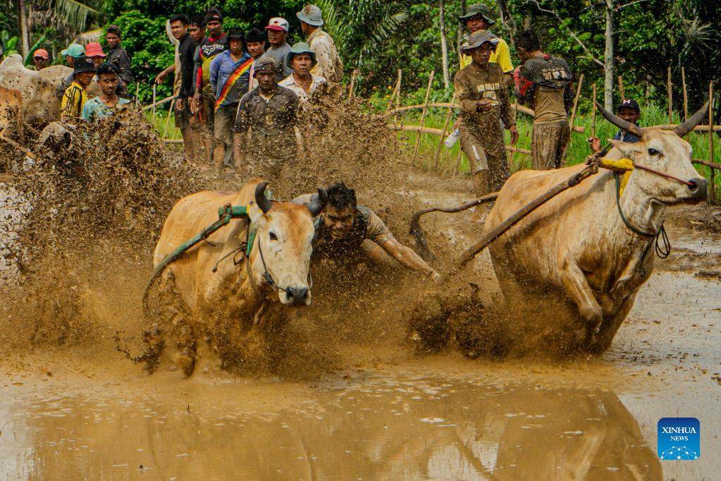 People participate in a traditional Pacu Jawi cow race at Nagari Labuah, in Tanah Datar of West Sumatra, Indonesia, Feb. 12, 2022. The Pacu Jawi is held annually in muddy rice fields to celebrate the end of the harvest season. (Photo by Kurniawan Masud/Xinhua)