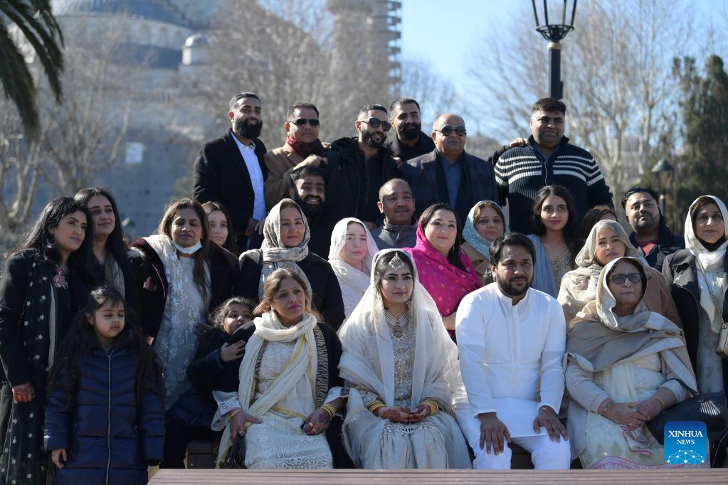A couple poses for photos with their relatives on Taksim Square in Istanbul, Turkey, Feb. 11, 2022. (Xinhua/Shadati)