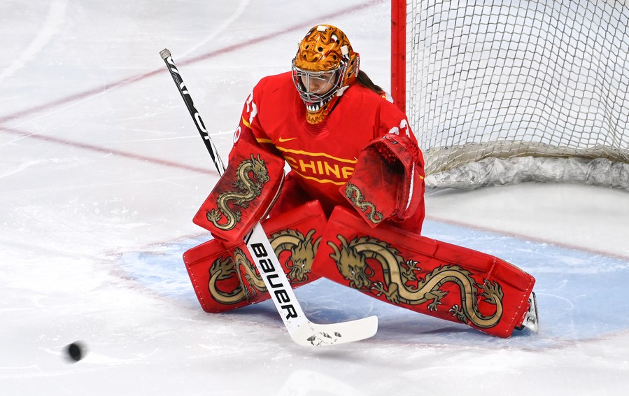 Goalkeeper Zhou Jiaying of China prepares prior to the ice hockey women's Group B match between China and Japan at Wukesong Sports Centre in Beijing, capital of China, Feb. 6, 2022. (Xinhua/Liu Xiao)