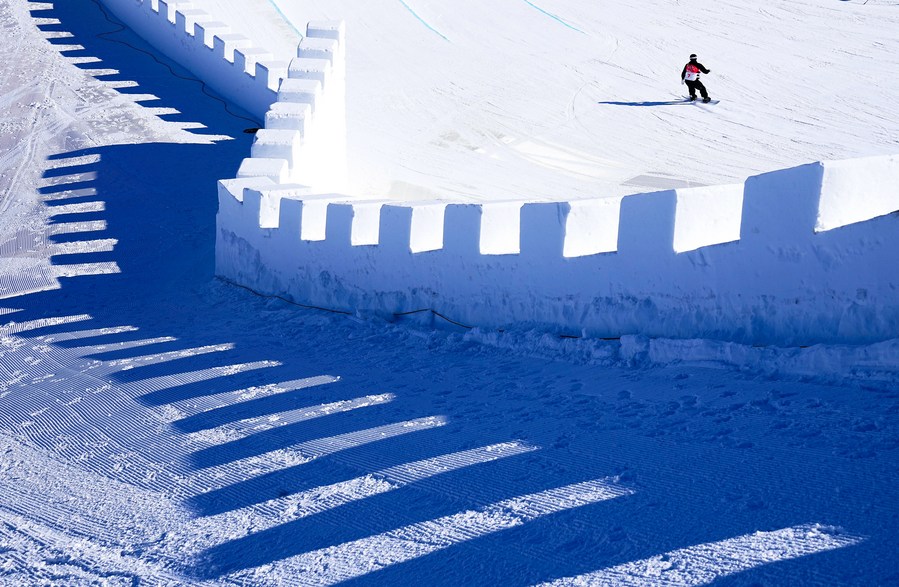 A snow Great Wall-shaped track has been built for the slopestyle event at the Genting Snow Park in Zhangjiakou, north China's Hebei Province.