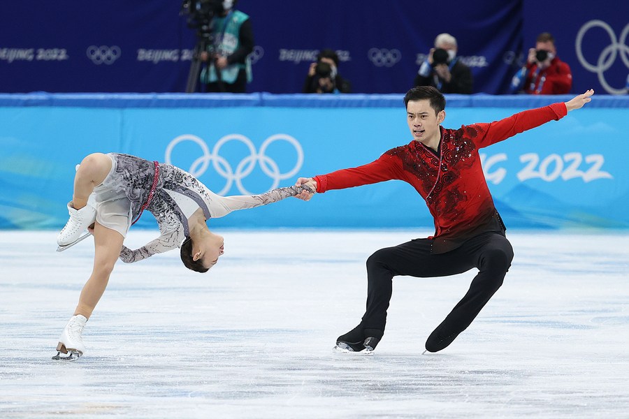 Peng Cheng (L) and Jin Yang of China perform during the figure skating team event pairs free skating at Capital Indoor Stadium in Beijing, capital of China, Feb. 7, 2022. (Xinhua/Zhang Yuwei)