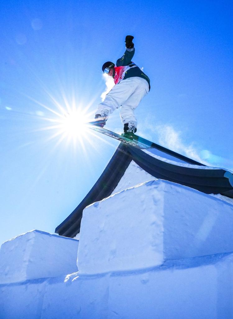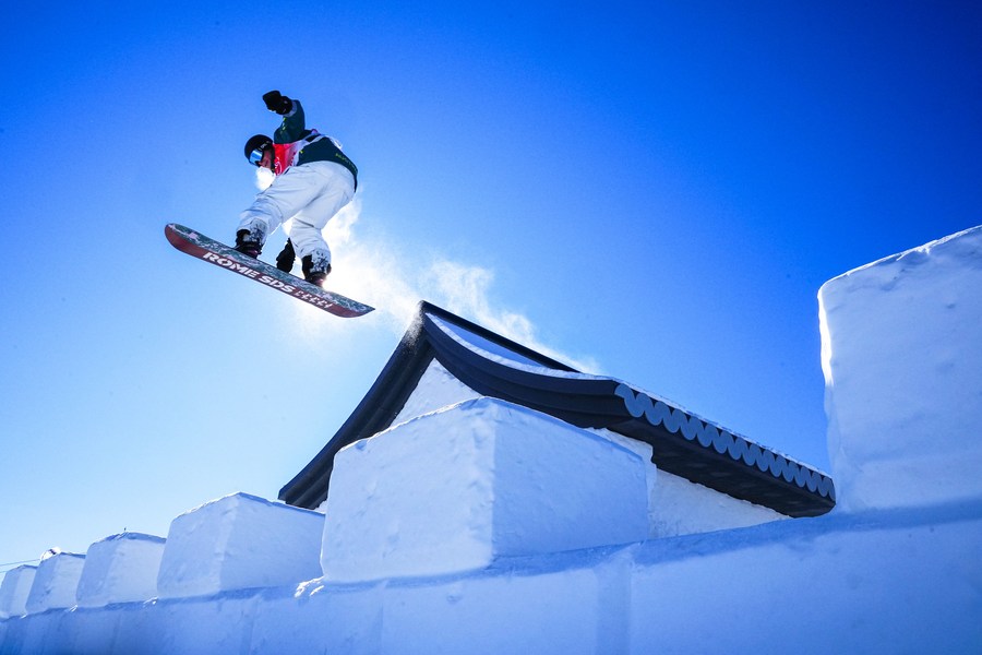 Matthew Cox of Australia attends a slopestyle snowboard training at the Genting Snow Park in Zhangjiakou,north China's Hebei Province, Feb.2, 2022. (Xinhua/Xu Chang)