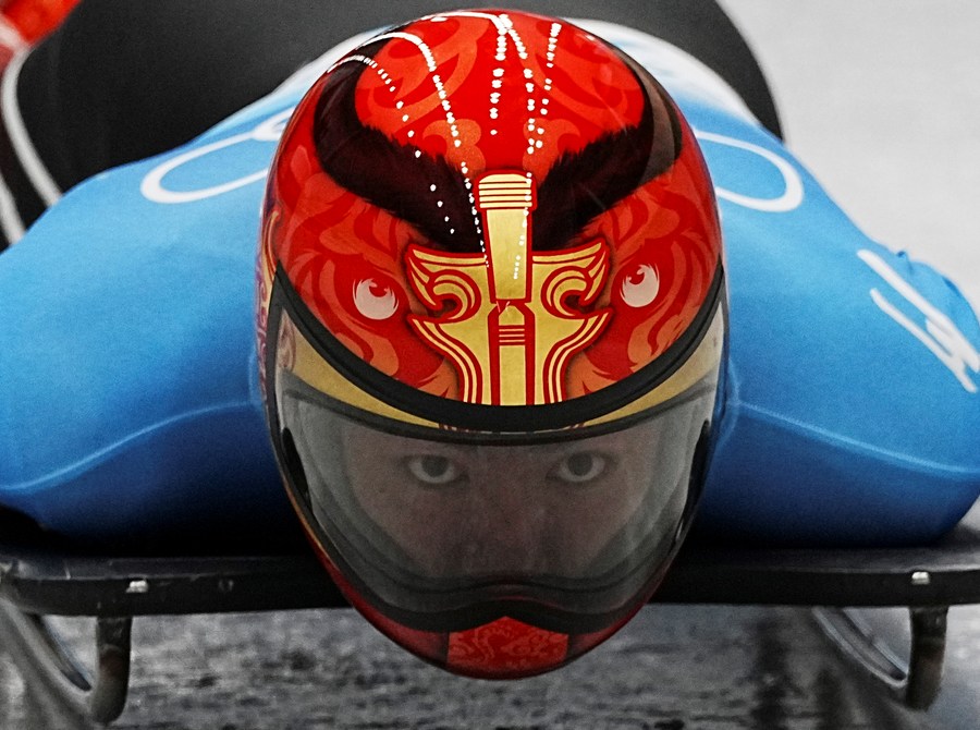 Yin Zheng of China competes during skeleton men heat of Beijing 2022 Winter Olympics at National Sliding Centre in Yanqing District, Beijing, capital of China, Feb. 11, 2022. (Xinhua/He Changshan)