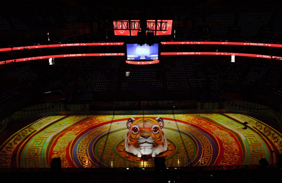 Photo taken on Feb. 11, 2022 shows a light show before the ice hockey women's play-offs quarterfinals between the United States and the Czech Republic at Wukesong Sports Centre in Beijing, capital of China. (Xinhua/Meng Yongmin)■