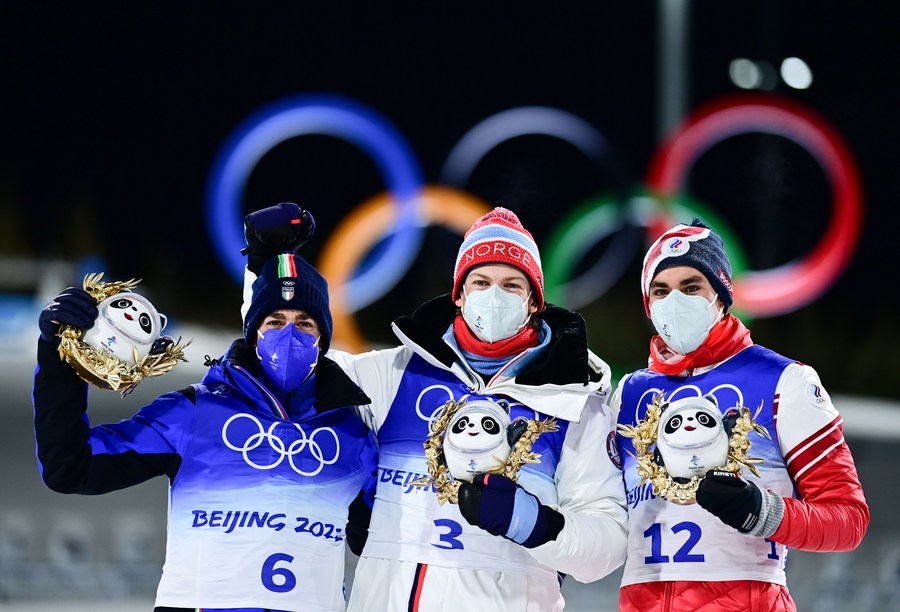 Gold medalist Johannes Hoesflot Klaebo (C) of Norway, silver medalist Federico Pellegrino (L) of Italy and bronze medalist Alexander Terentev of ROC pose for a photo with Bing Dwen Dwen, the mascots of Beijing 2022 Olympic Winter Games, during the flower ceremony of the men's cross-country skiing sprint free final of the Beijing 2022 Winter Olympics at Zhangjiakou National Cross-country Skiing Centre in Zhangjiakou, north China's Hebei Province, Feb. 8, 2022. (Xinhua/Zhang Hongxiang)