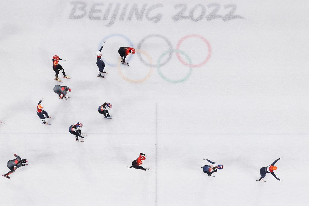 Florence Brunelle of Canada, Zhang Chutong of China and Selma Poutsma of the Netherlands (front L to R) compete during the women's 3,000m relay final of short track speed skating at Capital Indoor Stadium in Beijing, capital of China, Feb. 13, 2022. (Xinhua/Lan Hongguang)