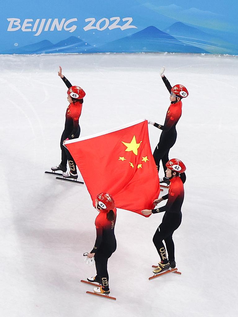 Team China celebrate after winning the bronze medal in the women's 3,000m relay final of short track speed skating at Capital Indoor Stadium in Beijing, capital of China, Feb. 13, 2022. (Xinhua/Xu Zijian)