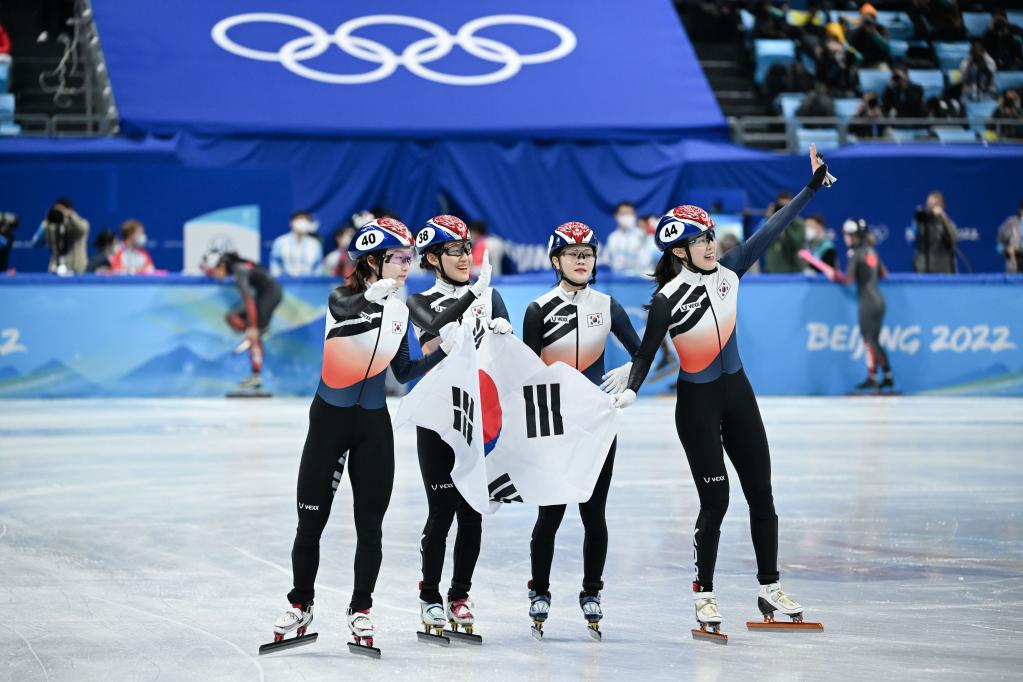 Team of South Korea celebrate after winning the silver medal in the women's 3,000m relay final of short track speed skating at Capital Indoor Stadium in Beijing, capital of China, Feb. 13, 2022. (Xinhua/Ju Huanzong)
