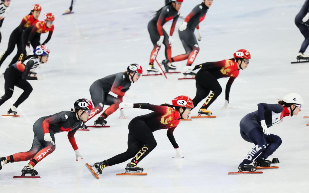 Fan Kexin (3rd R) of China sprints to the finish line during the women's 3,000m relay final of short track speed skating at Capital Indoor Stadium in Beijing, capital of China, Feb. 13, 2022. (Xinhua/Xu Zijian)