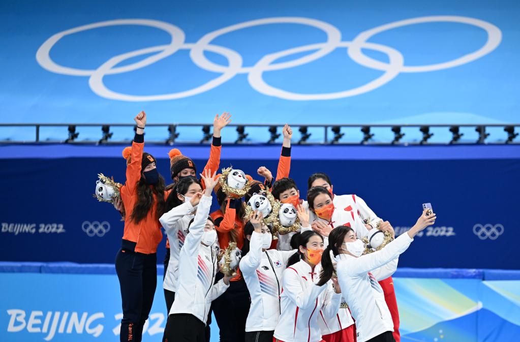 Gold medalists of Team of the Netherlands take a selfie during the flower ceremony of the women's 3,000m relay final of short track speed skating at Capital Indoor Stadium in Beijing, capital of China, Feb. 13, 2022. (Xinhua/Ju Huanzong)